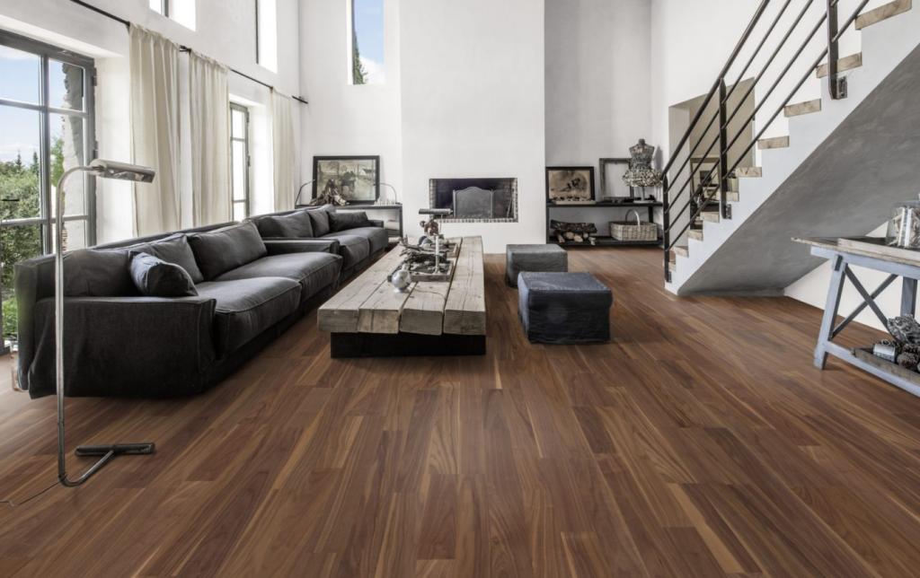 Los tonos café en este piso de nogal de 2 lamas de la colección Lodge destacan las variaciones de color rubio en las tablas. Los nudos que ocurren naturalmente agregan profundidad y carácter al piso, dando como resultado una expresión clásica y atemporal.