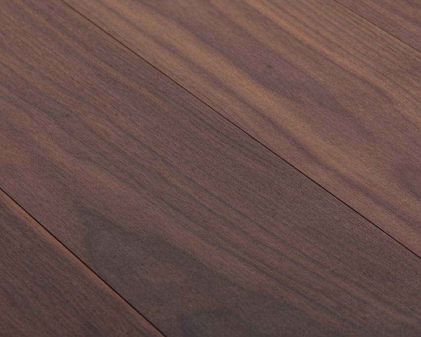 Tablones de nogal de tres capas con un pequeño bisel en el lado longitudinal y aprox. 4 mm de capa transitable, así como aprox. 4 mm de contrapieza del mismo tipo de madera. Entre medias, una capa intermedia de madera blanda. Machimbrado en todas las partes para una colocación sin límites. Se permite una baja parte de entablillado, nudos sanos, áreas de enmasillado de hasta 15 mm de diámetro e inclusiones puntuales.