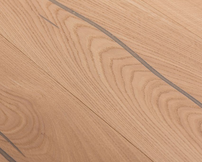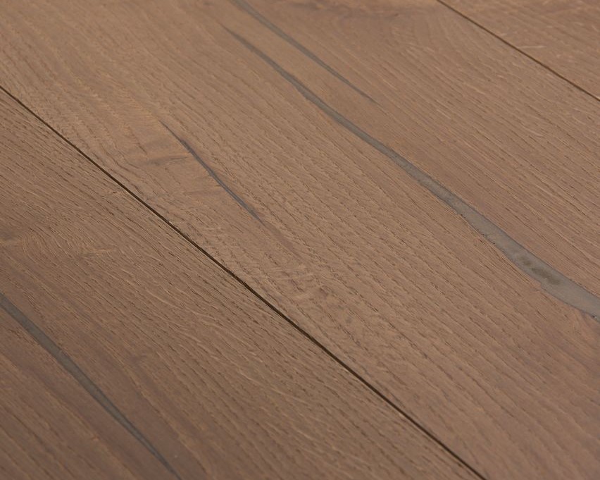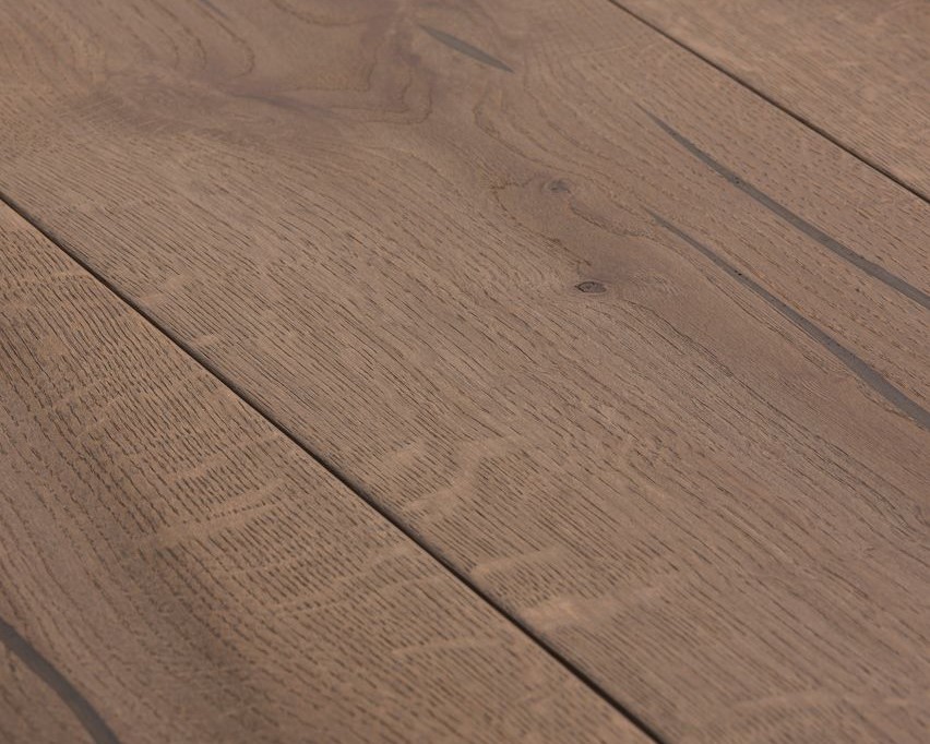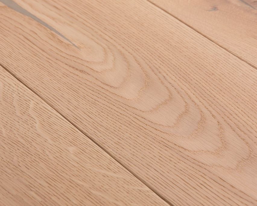 Tablones de roble de tres capas con un pequeño bisel en el lado longitudinal y aprox. 4 mm de capa transitable, así como aprox. 4 mm de contrapieza del mismo tipo de madera. Entre medias, una capa intermedia de madera blanda. Machimbrado en todas las partes para una colocación sin límites. Son posibles divergencias de color así como partes laterales de entablillado. Se permiten pequeñas grietas abiertas y áreas no enmasilladas en un grosor de milímetros. Las grietas, los agujeros de nudos y los nudos grandes se destacan con masilla.