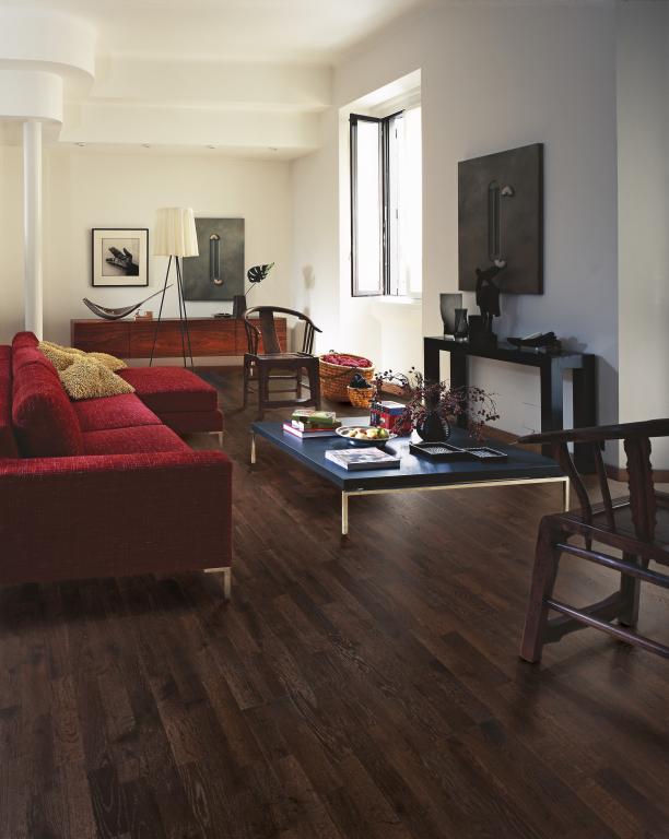 Los tonos de dominó negro en este piso de roble de 3 lamas de la Colección Harmony crean una expresión lujosa que realza una amplia gama de interiores. Cada tabla se cepilla cuidadosamente para resaltar el carácter del grano y resaltar la textura natural de la madera. El acabado de laca mate elimina el resplandor y protege la madera del uso diario.