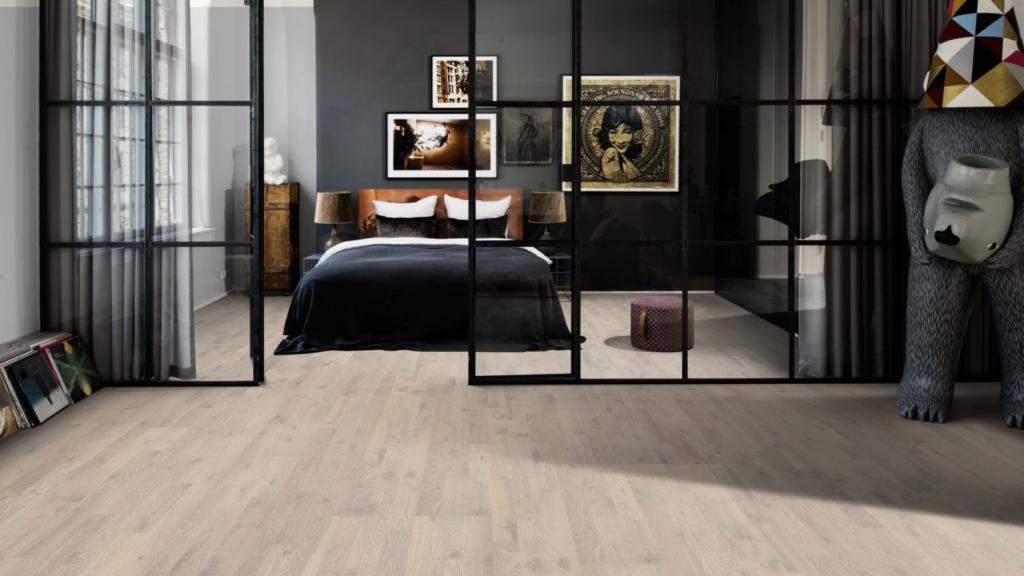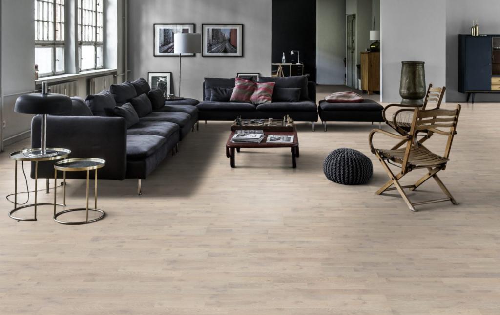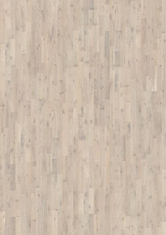 El acabado en blanco polvo con un contraste suave en este piso de roble de 3 lamas de la Colección Harmony permite que se vean los matices más cálidos. El acabado de laca mate elimina el resplandor y protege la madera del uso diario. Cada tabla se cepilla cuidadosamente para resaltar el carácter del grano y resaltar la textura natural de la madera.